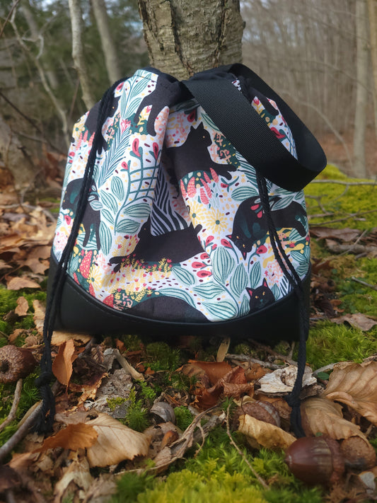 Drawstring Bags all have a side strap and black vinyl boxed bottom.