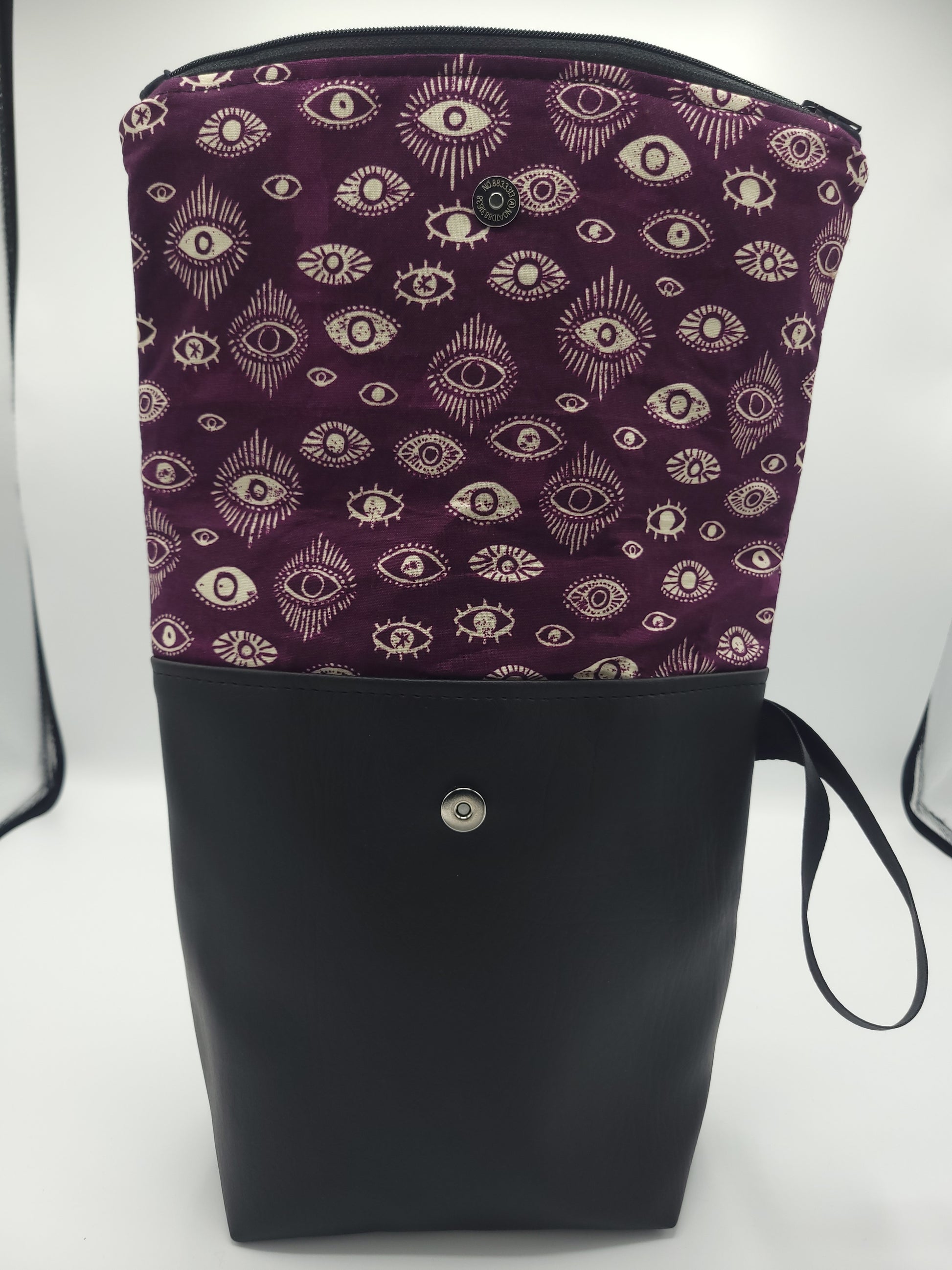 These eyes are always watching fold-over project bags are perfect for a medium to large project. Plenty of space 3-4 skeins. All bags are lined with water resistant canvas to keep your projects secure. There is also a top zipper and a magnetic snap to keep the bags fold in place. There is also a side strap to carry around your project.