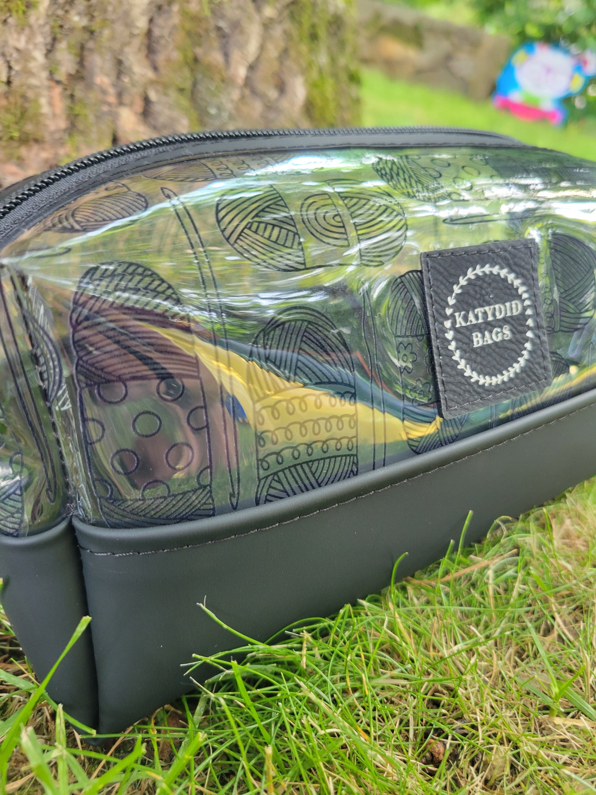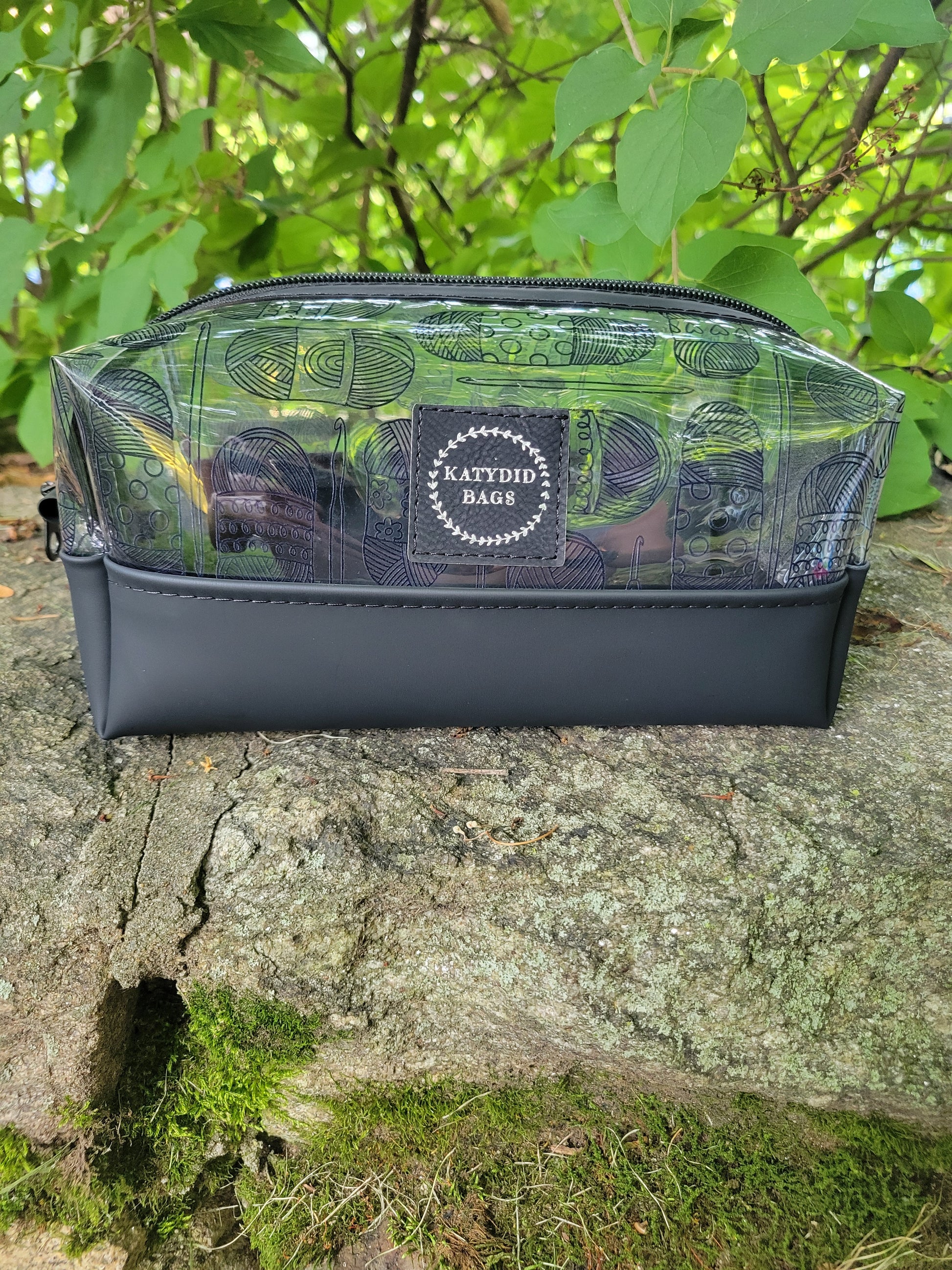Yarn skeins and crochet hooks clear vinyl boxy pouch